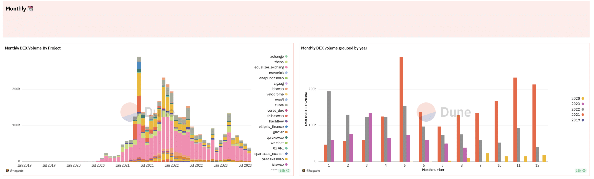 According to Dune Analytics Data, the number of new users, daily transactions, and daily volumes have surged in 2023, doing about $10 billion in volume weekly, dominated by Ethereum-based DEX aggregators.