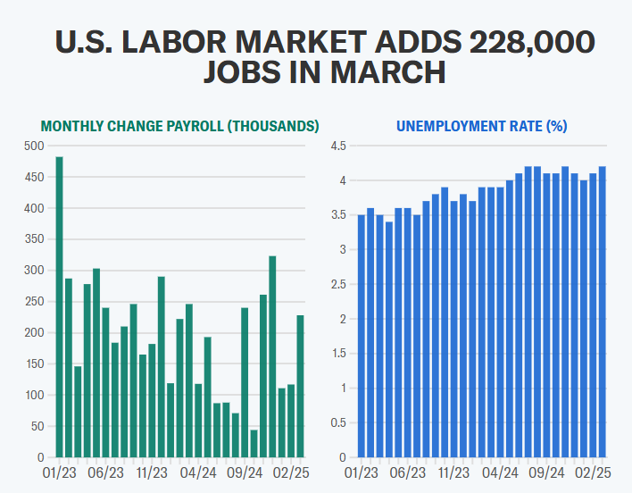 March saw the economy add 228,000 jobs. The unemployment rate for that month stood at 4.2%.
