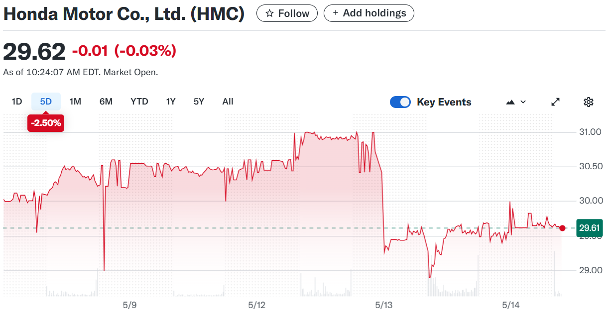 - Honda stock trades at $29.60 after a sharp drop in quarterly profits